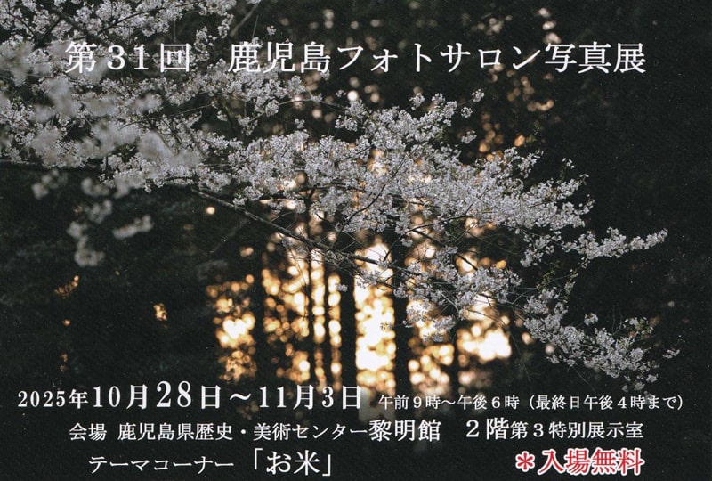 加盟団体写真展情報 第31回 鹿児島フォトサロン写真展 開催のご案内 第31回 鹿児島フォトサロン写真展 開催のご案内です。 【会場】鹿児島県歴史・美術センター 黎明館2F(第3特別展示室) 【会期】令和7年10月28日(火)~11月3日(月) 【時間】午前9時~午後6時(最終日は午後4時まで) 【入場】無料